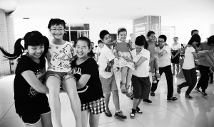 7月17日,青少年在老师的示范、讲解下学习双人徒手搬运伤员。当天,老师向青少年们讲解意外伤害急救自护知识和技能并进行现场演练,帮助青少年增强安全防范意识,提高自救自护能力。 海报集团全媒体中心记者 张茂 摄