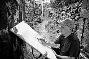 7月25日,海口市荣堂村。来自广东中山市小榄镇美术家协会的13名美术工作者冒着细雨在荣堂村写生,用手中的画笔记录这座有800多年历史的火山石建筑古村落。