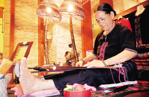 7月23日,来自五指山水满乡的70岁黎族老阿婆刘秀芳在三亚鸿洲埃德瑞酒店大堂表演黎族织锦,向游客展示独具特色的传统民族手工技艺。