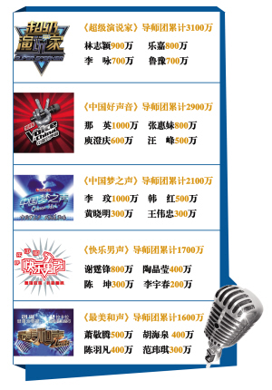 最近,电视音乐真人秀节目大战,从罗大佑、章子怡、陈奕迅到那英、汪峰、张惠妹、韩红、黄晓明、李玟、陈坤、谢霆锋、李宇春、陶子等,几乎全部音乐大牌明星都被请来当导师,而即将露面的还有孙楠、陶喆等,显然这些明星并不是“没有事情”的过气艺人,他们都是正当红,因此没有高价是不可能“出山”来做一档选秀节目的。在曝光的这份导师身价表中,一共出现了5档暑期热门真人秀节目,分别是《中国好声音》、《超级演说家》、《中国梦之声》、《快乐男声》、《最美和声》。其中,《中国好声音》的那英和《中国梦之声》的李玟分别以1000万元高居第一,而为自家卫视节目站台的李宇春,则以200万元的友情价垫底。