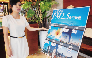 7月28日,供职于海口某楼盘的售楼员蒋海云站在一块全国主要城市当日环境空气质量标准牌前,向前来看房的客人介绍由环保部门发布的海口PM2.5指数,并与内地一些城市的PM2.5指数进行对比,让客人切身感受到海南的优良空气和良好的生态环境。 本报记者 苏建强 摄