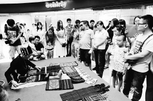 7月27日,保亭黎族苗族自治县在广州市举办夏季旅游产品广东推介会。图为黎族阿婆现场织锦,吸引众多眼球。