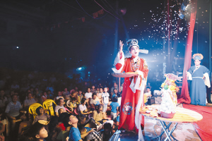 7月27日,农历六月十九,临高调楼镇调楼渔村一改往日的静谧,当地渔民非常喜爱的临高剧即将在村里的老戏台上演。晚上7点多,老戏台上,演员们正在紧张有序地上妆、布景、调音,而戏台下、树杈上、阁楼里早早就挤满了密密麻麻的渔民。八仙过海、钦点状元、翁式闹公堂等琼剧,在喧天锣鼓声中上演。当晚,这个地处北部湾畔,村民以出海打渔为生的村庄,通过“请观世音看戏”的方式,祈求观音保佑全村出海平安、满载而归。