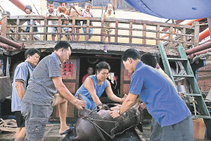 “对渔民来说,开渔前祭祀祈福是一件非常神圣的事。”黄家轻介绍,不但要在家里办,还要去船上办,并且还要在船上杀猪、杀鸡,祈愿平安顺利,满载而归。船上的祭祀,祭司带领渔民们绕船走一圈,每到舱室门、渔具以及船舷边上,祭司就洒上“神水”,渔民们在撒过“神水”的地方贴上符篆,祈福驱邪避难,出海逢凶化吉。杀猪的过程很是热闹。几个年富力强的小伙联手把一头两百多斤的黑猪抬到木台案上,按住身体和四肢,船主黄家轻亲自操刀。献给神明的牲畜也有讲究,猪一定要又大又肥,体现对神明的恭敬。