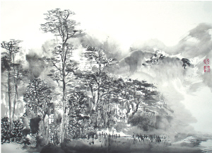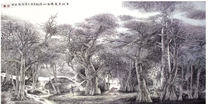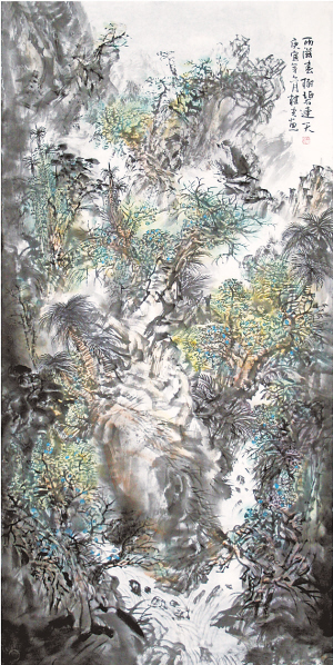换个角度,游桂光国画中不同一般的力量感还来源于他对“海南山水”乃至“南方山水”的思考。他以为,与南方植物茂盛等特点相适应,南方山水多以繁复构图、细线描绘为主,这样非常具象生动,但有时也会失之琐碎,所以他也借鉴了北方山水画派诸如泼墨等的笔法,且揣摩其宏大的气势。游桂光笔下的“海南山水”苍劲健拔、大气磅礴的突出面貌,看来也所来有自。