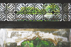 将南洋风格与本地建筑元素相结合是海南华侨建筑的普遍特点,符家宅中的海南人文元素更是随处可见。除了结构设计外,木雕、石雕、灰塑、浮雕、阴雕、镂空等中式传统工艺在松树大屋里的细节处彰显无遗。兽首傲然雄踞在檐头,一朵莲花浅浅地雕在拱形窗框上方,只剩下一半的木窗上镂雕的松树与蝙蝠还清晰可见,墙头与墙角的彩绘灰塑与青苔夹缠在一起,墙头几何线条组合方式,带着岭南建筑的风格,收敛贵气,简约明快。