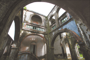符家宅中大半木质窗框已经松松垮垮,或是干脆不存在了,只有一扇半扇窗框上的雕花依稀地描摹着曾经的辉煌;房顶的瓦片七零八落,不知所终,横梁被拆卸得只剩下孤零零的一根还支撑着,追忆它杳无踪迹的同伴;青苔和野草悄悄爬上高墙,取代了雕花与彩绘,重新用斑驳陆离装点这墙壁;爬上正屋二楼的木质台阶和二楼的木质楼板早已腐朽,二楼那美妙的伊斯兰风情的圆窗与阳台再也无法迎来凭窗眺望的人了。宅院楼体之间疯狂生长的绿色植物,却仿佛老宅生命的延续一样,伸展恣肆。