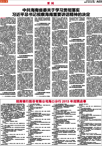中共海南省委关于学习贯彻落实 习近平总书记视察海南重要讲话精神的决定