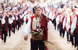 8月4日,身着传统服饰的男子在克罗地亚南部锡尼参加传统马术比赛。