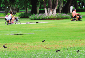 海口万绿园内,绿草如茵,鸟儿在草地上悠闲觅食,经过的市民不少,但没有一个人去打扰鸟儿们的清静。据了解,目前长期栖息在海口万绿园的鸟儿有六七个品种,约数百只。 本报记者 古月 摄