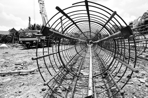 日前,海口红城湖路延长线工地上,架设桥梁的柱梁正在浇灌水泥。该项目建成后可贯通海府路和滨江西路,计划今年底完成建设。 本报记者 古月 摄