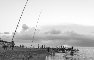 8月4日晚7时15分,夕阳正落,天高云舒,风起潮涨。海口市白沙门海岸,有不少市民在此垂钓赏景。 本报记者 王军 摄