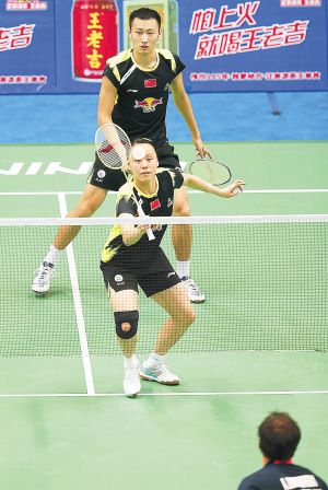 8月6日,在广州进行的2013年世界羽毛球锦标赛混双比赛中,中国选手张楠/赵芸蕾以2:0战胜瑞士选手迪马尔特雷/雅克,轻松晋级。图为张楠(上)/赵芸蕾在比赛中。 新华社发