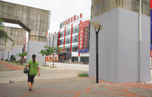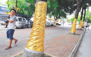 8月6日,海口南海大道汽车南站附近的东环高铁几根水泥桥墩被刷成红色,影响司机视线,被本报曝光后,这里的桥墩已被刷成灰色。可商家为了营造喜庆氛围,又用金色装饰布将一排椰子树的树干包了起来。 本报记者 张杰 摄