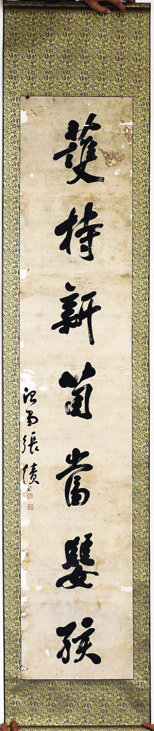 因在内地为官,张绩在海南留下的书法作品留存的并不多。素来喜欢收藏书画的张健平说,此前只知海南省博物馆收藏有一幅张绩《草书临孙过庭<书谱>》屏的纸本,“这副对联便是第二件,极具收藏价值”。