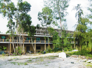 乍一看,两栋楼房仿佛处在海防林包围之中,但仔细观察发现,有一堵围墙和三角梅形成的隔离带,将会所建筑工地与海防林隔开。