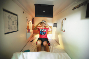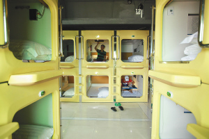 8月13日,海口市国贸路,一栋写字楼内新开一家名为“太空舱”的胶囊公寓。据介绍,造价约1万元的“太空舱”虽小,却“五脏俱全”,其内长约2米、宽约1米、高1.2米,备有床铺、壁挂式液晶电视、梳妆台、折叠式电脑桌等。这是海南首家胶囊公寓,主要供都市白领午休,每小时仅需8.8元。(图①为胶囊公寓外观;图②为顾客在“太空舱”内戴着耳机看电视 )