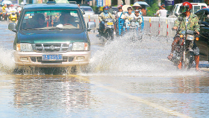 图1 8月4日,东方市八所镇解放路,一辆车飞快经过,积水溅湿路人。