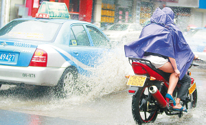 图2 8月14日,海口市西沙路,一辆出租车溅起大面积水花,骑车市民躲避不及。