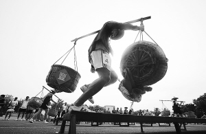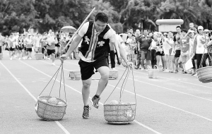 ④参赛队员在“男女挑担障碍赛”中奋力拼搏。