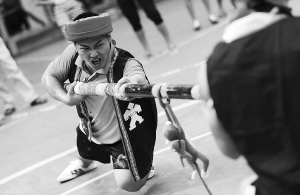 ②参赛队员们在“顶棍”项目比赛中的有趣场景。