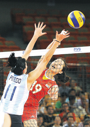 8月16日,在武汉举行的世界女排大奖赛(武汉站)中,中国队以3:0战胜阿根廷队。图为刘聪聪(右)在比赛中扣球。 新华社发