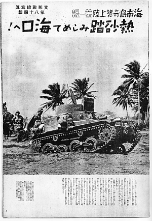 1939年1月19日,日军下达第265号命令进攻海南。2月10日,日本侵略军第五舰队司令长近藤信竹中将和陆军第21军司令长官安藤利少将指挥“台湾混成旅团”从天尾港登陆,占领府城;日军海军第五舰队载着佐世保海军陆战队从雷州半岛深尾湾启航,于2月14日占领三亚、榆林和崖县。随后,日军以海口、三亚、崖城为据点,分别向南、向东、向北,向东南沿海及内陆地区进攻,形成南北夹击包抄之势,在短时间内侵略整个琼岛,琼崖军民长达6年多的血泪抗战史自此开始。