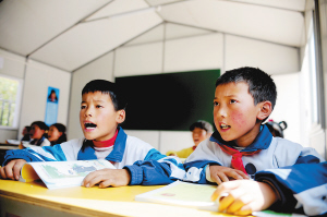 甘肃岷县震区230所因灾受损学校将如期开学。图为8月25日,在甘肃岷县永星村,由兰州军区援建的板房学校———扎扎小学的板房教室内,学生们在朗读课文。 新华社记者 张锰 摄