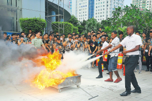 为增强全民消防安全意识,8月27日下午,海口市消防支队官兵走进国贸时代广场甲壳虫KTV,组织员工开展逃生疏散演练,现场传授火灾逃生疏散常识和技能。图为消防官兵指导参演人员操作灭火器。 本报记者 武威 通讯员 何宏国 摄