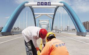 琼州大桥是海文高速公路连接线上的特大桥,是海口市东拓的主通道之一。该桥已“服役”10年,存在一定安全隐患,如大桥吊杆拱下锚头不同程度渗水,钢管拱拱背混凝土有脱空现象,桥面铺装出现网状裂缝等,亟需加固维修。此次维修加固,总投资1000多万元。