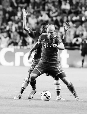 图为拜仁球员罗本(前)与切尔西队的阿什利·科尔在比赛中拼抢。 新华社发