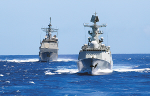 9月9日,中美两国海军参演军舰组成编队进行演练。当日,中美两国海军在夏威夷附近海域举行了复杂条件下海上联合搜救演习,双方共4艘舰艇、3架直升机参加,这是7年来中美首次联合演习。参演兵力包括中国海军青岛舰、临沂舰和一架舰载直升机,美国海军导弹巡洋舰伊利湖舰、一艘辅助船和“海鹰”、“黑鹰”直升机各一架,两国海军参演官兵近1000名。 新华社发