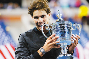 西班牙名将纳达尔10日经过3小时21分钟苦战以6:2、3:6、6:4、6:1击败现世界排名第一的塞尔维亚选手德约科维奇,夺得职业生涯第二个美网冠军。通过这场胜利,现年27岁的纳达尔将自己的大满贯冠军总数提升至13个。图为纳达尔在颁奖仪式上“咬”奖杯。 新华社发