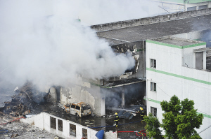 9月10日11时50分,广州市西槎路骐利广场对面一仓库发生爆炸,爆炸引发仓库大火,现场初步发现,有4具残骸,14人受伤,伤者已被送往医院救治。经初步核查,事发仓库为荔湾区西郊村增埗社物业,主要储存鞋料物资。事故原因正在调查中。 新华社记者 梁旭 摄