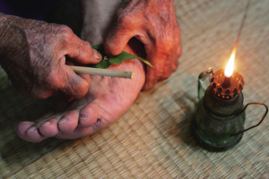 去年10月,本报记者到陵水黎族自治县英州镇军田村一户农家采访,院子里,一位腿上敷着药的年轻人坐在凳子上,他叫黄阿雄,因车祸导致右足胫内粉碎性骨折。91岁老黎医蓝生仁正在帮他治疗。