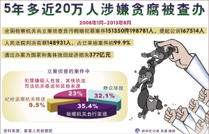 报告显示:2008年1月至今年8月,全国检察机关共立案侦查贪污贿赂犯罪案件151350件198781人,提起公诉167514人。其中,立案侦查厅局级1029人、省部级以上32人。依据报告数据测算,我国每天近百人涉嫌贪腐被查。