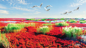辽宁盘锦市的红海滩是大自然孕育的一道奇观。以全球保存最完好、规模最大的湿地资源为依托,以举世罕见的红海滩、世界最大的芦苇荡为背景,是一处自然环境与人文景观完美结合的纯绿色生态旅游系统。