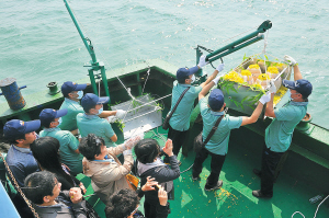 10月22日,参加骨灰撒海活动的亲属在船上向逝去亲人的骨灰告别。