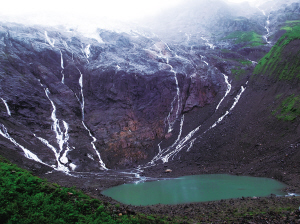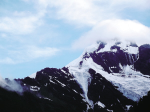 冰湖位于梅里雪山将军峰脚下,海拔约4100米,由冰川融水构成。从大本营出发,沿着狭窄陡峭的小路一路攀升,约一小时可达冰湖。远远看到冰川露出一顶银白色,极大地惊喜。耗费4个小时左右到达冰湖,看到冰湖的真正面目。远处看到的那一顶银白,是冰川最高处的积雪,冰川倾泻而下,在山脚下形成一个巨大的绿色湖泊,冰川汹涌磅礴,冰湖静谧无声,站在冰湖旁边的小山坡上,碧蓝的湖水倒映着蓝天白云,在周围白色雪峰的映衬下,平静安详。湖边有很多大大小小的玛尼堆,这也是游客到此必做的事情之一,和同行者一起堆个玛尼堆,寄托自己的愿望和祝福,在寒冷的冰川脚下,通过自己的双手,向神灵祈福。