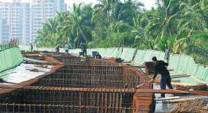 10月27日,连接琼海博鳌—潭门两镇的潭门大桥续建工程正加紧建设中。大桥预计明年元旦建成通车,潭门到博鳌不到10分钟。
