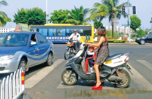 10月25日,海口红城湖路段,一名女子骑着电动车载孩子闯红灯过马路,十分危险。记者在该路口蹲守发现,诸如闯红灯、违规载人等不文明现象十分常见。