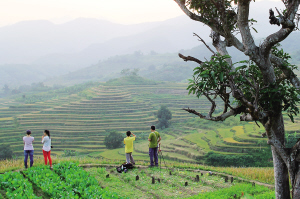 10月27日上午,摄影爱好者正在五指山市毛阳镇牙胡村拍摄梯田美丽秋色。