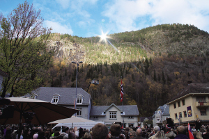 留坎镇因四面环山,每年9月下旬到来年2月上旬都没有阳光直照,镇上居民只能坐缆车到山顶晒太阳。镇政府经过长达5年的讨论,终于在今年投资500万挪威克朗(约合500万元人民币)在山上安装一组由3面大镜子组成的反光镜,它们能跟踪太阳自动调整角度,将阳光反射到镇中心广场。建造大型反光镜的设想是1913年由挪威工业家萨姆·艾德提出的,因受技术限制,此前一直未能实现。新华社记者 刘敏 摄