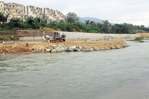 10月30日,五指山市南圣河防洪整治工程工地,工人们正在操作工程机械施工。 南圣河防洪整治工程项目计划整治河道11公里,项目建成后,能防御20年一遇洪水,保护耕地面积上千亩,对提高城市防洪排涝功能、城市滨河休闲景观功能和风景绿化功能等有积极重要的作用。