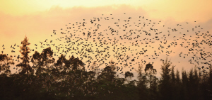 10月30日,琼海万泉河上空,大批丝光椋鸟在夕阳下飞翔。深秋时节,大批候鸟陆续南迁。每天傍晚,风光秀美的琼海万泉河畔,夕阳下大批成群结队的候鸟不时从空中飞过。