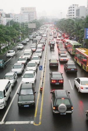 通过对2012年海口主干道车流量的监测,上下班期间,全市车流量达到4000辆/小时以上的主干道超过了10条。2012年每天在海口33平方公里市中心区域行驶的机动车总量有近50万辆。