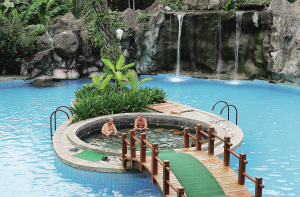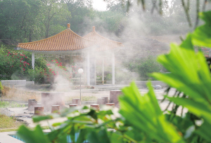 位于海口观澜湖度假区内的火山岩矿温泉中心,被开发商设计成了涵盖六大洲风情的特色泡汤主题区。据了解,这个主题区共设有150个冷、热泉汤池及99个流水景观。这里的泉水取自地底深达800米处,自然水温在15℃至43℃之间,蕴含多种保健功效的天然矿物成份,对皮肤病、风湿病、关节炎等有治疗作用。