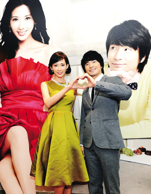 11月10日,跨国浪漫爱情电影《甜心巧克力》发布会在武汉举行。图为主演林志玲(左)与福地祐介在发布会上合影。新华社发