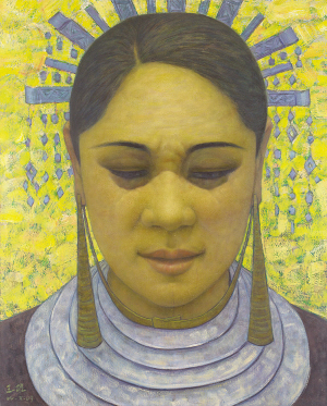 同样打动人心的肖像画作品叫《将要出嫁的德苏·摆媛》。第一眼见到这幅画,让人不由一惊又一呆。画面上只有硕大的一张脸,并不是青春少女的俏模样,虽然脸蛋儿还圆润,却像是个30来岁的老姑娘了。她的双眉描画得又黑又长,唇上抹了胭脂,戴着华丽的黎族饰品。看来,这姑娘是说成了一门好亲事。可是,她那个神情……画家的高明就在这里:王雄笔下的黎女,通常都有着很强的相似性:浓眉大眼,宽额厚唇,或盘绕发髻,或长发飘逸。而此刻,他没有去描绘一个新嫁娘常见的喜悦或羞涩,他让她双眸下垂,眉头紧蹙,好像很有些难过,却也不是十分的伤悲,因为她的嘴角微微扬起,分明蕴含了一个隐隐的笑意……说吧,哪个女子在将要出嫁的时辰,没有过类似一种无比复杂的心绪与表情?说吧,要多么敏锐的一双画家的眼睛才能捕捉到这一刻?