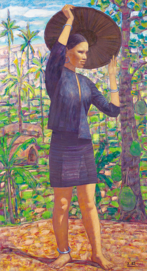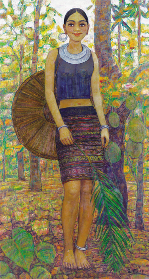 1891年6月高更抵达南太平洋的小岛大溪地,该地的美与神秘,令他深深着迷。在那片原始、未开发的纯真之地,他把“野蛮人”理想化,认为是受本能引导、接近自然的人,是真正创作的泉源。王雄,四处漂泊流浪之后,也毫无争议地将自己定位为一个“海南本土黎族画家。”他的笔只钟情于表现黎族、表现海南。在他看来,海南是一块纯净的地方;他的黎族,是一个最美好的民族。他依托着黎族的深厚文化,他也让自己通过艰难的个人奋斗,成为黎族人当中的好儿郎。